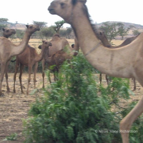 Along the road I saw this woman presumably carrying water, this thatch house, and a camel herder.