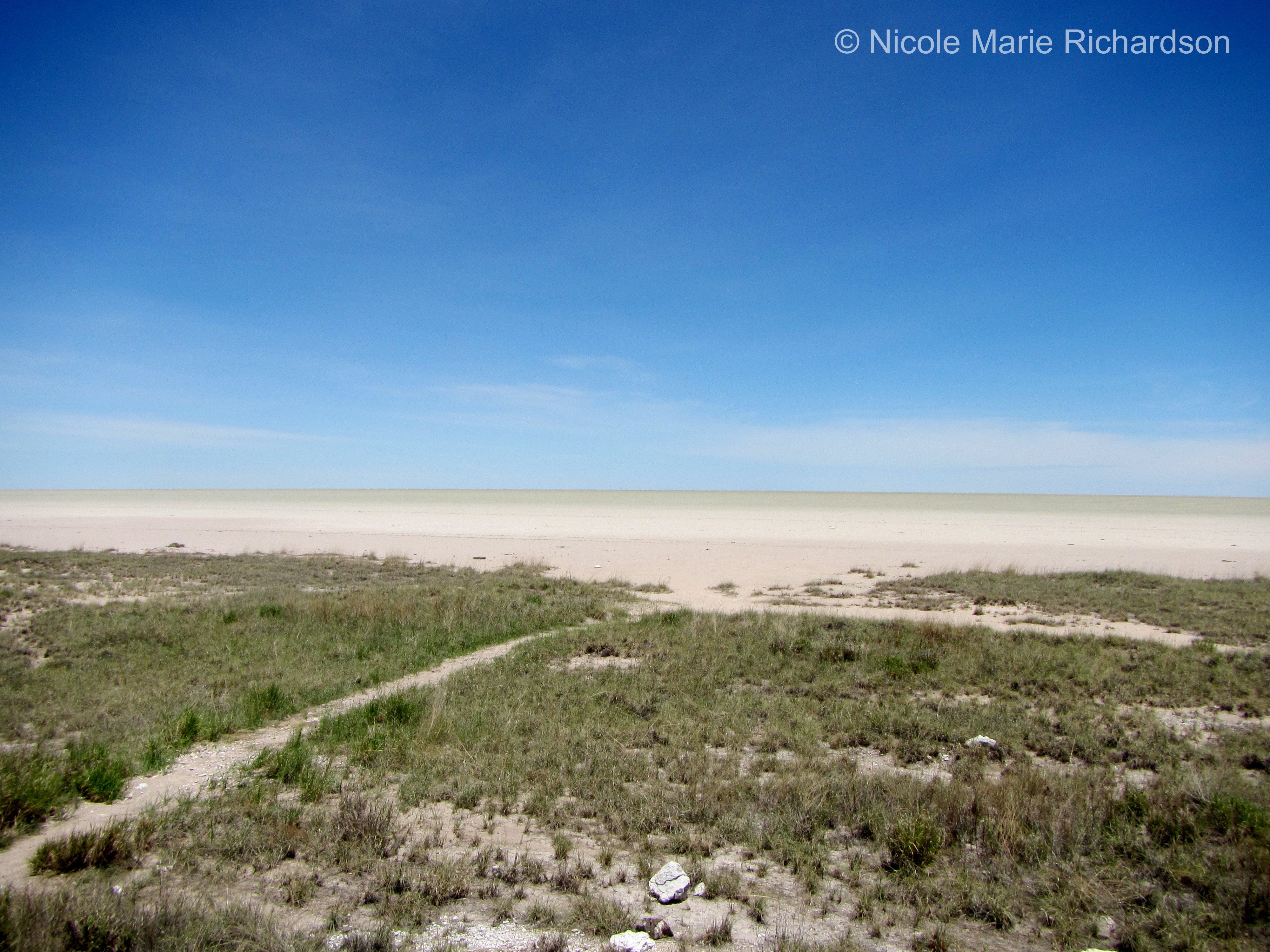 Then we piled back into the truck and headed to Etosha. Established in 1907, Etosha is best known for its huge salt pan–the dried-out remains of a former lake. Although the lake is empty, from a distance the salt pan looks full. The illusion makes for stunning photos.